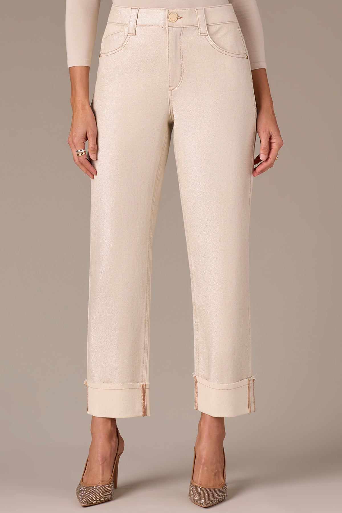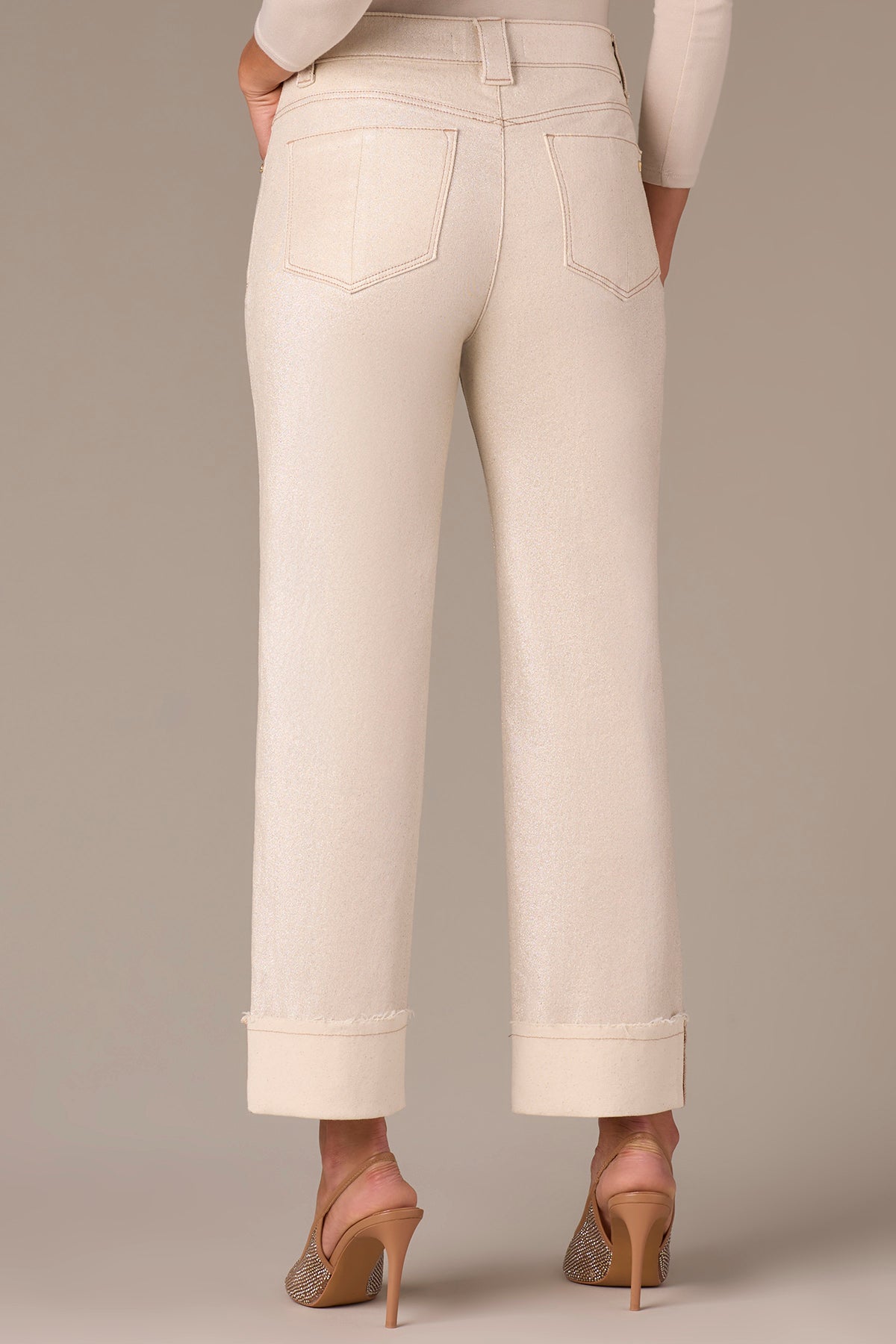 Discover refined elegance with these almond crop pants that seamlessly blend sophistication with subtle glamour. The deep cuff creates a polished silhouette while contrast stitching adds visual interest and dimension. Stretch waistband. A luxurious gold front button serves as the perfect finishing touch, complemented by delicate gold thread woven throughout the fabric for an understated shimmer that catches the light beautifully. The soft sheen elevates any outfit, making these pants ideal for both professional settings and elevated casual wear. Experience the perfect balance of comfort and stunning style.