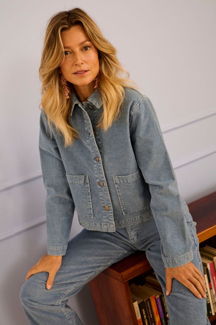 Elevate your everyday style with this sophisticated corduroy jacket in a distinctive dusty blue. Crafted from soft small wale corduroy, it offers texture and visual interest while maintaining timeless appeal. The straight-fit silhouette hits at the hip for a flattering, versatile length that works with everything from dresses to jeans. Sparkling buttons add an unexpected touch of glamour, while practical front pockets and a classic collar complete the look. Long sleeves provide layering flexibility across seasons. Pair it with the matching corduroy pant to create a coordinated set that's both refined and effortlessly chic.