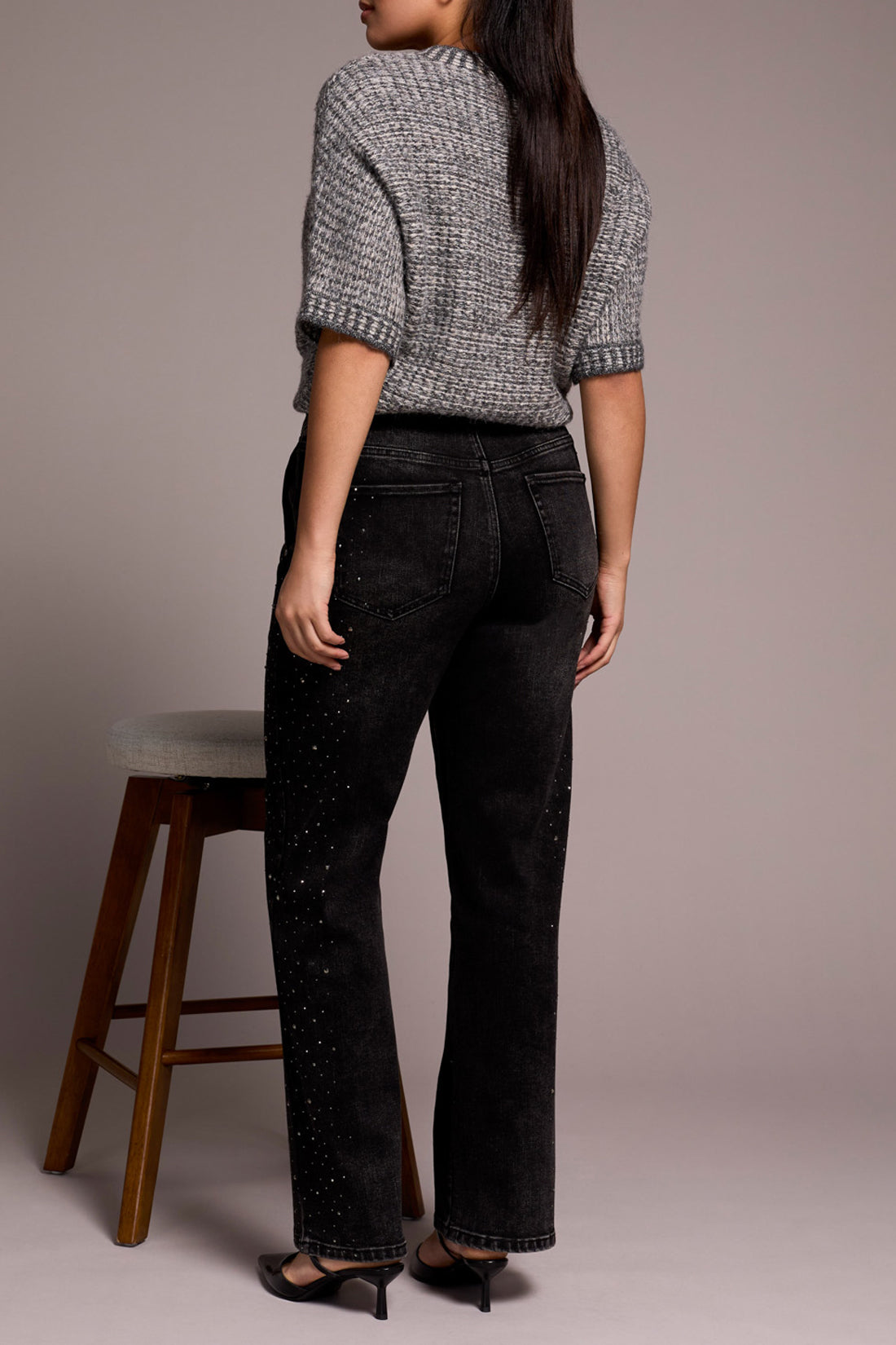 Elevate your denim game with these stunning super straight girlfriend jeans that blend timeless style with modern flair. Featuring eye-catching rhinestone embellishments cascading down the outside leg, these jeans transform an everyday staple into a statement piece perfect for holiday celebrations and special occasions. The classic dark black wash pairs beautifully with the five-pocket construction and convenient zipper front, offering both style and functionality. Whether you're dressing up for a night out or adding polish to your everyday look, these versatile jeans deliver the sophistication you're seeking.